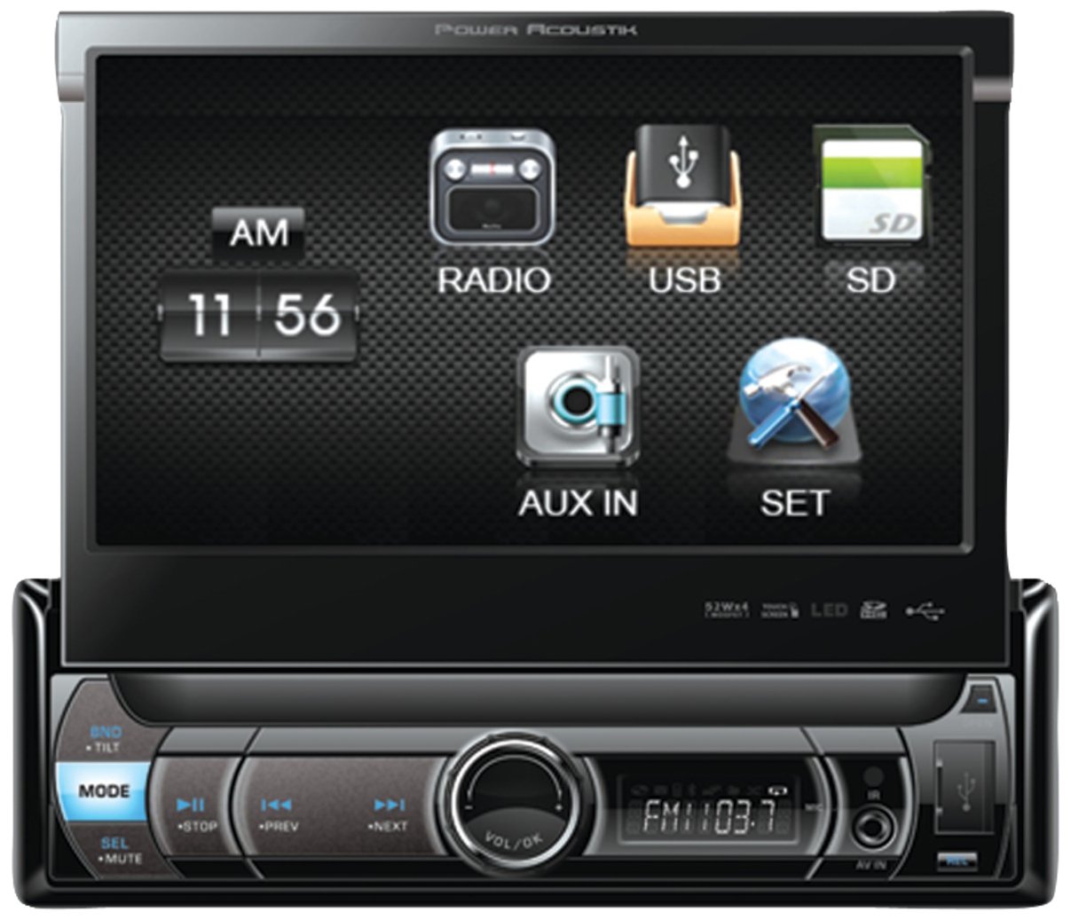 The Power Acoustik PDR-780 is a single DIN digital media receiver featuring a motorized flip-up 7-inch LCD touchscreen. This unit is designed to provide comprehensive multimedia entertainment and control in your vehicle. It supports various audio, video, and picture file formats from SD cards and USB flash drives, and includes an integrated AM/FM tuner.