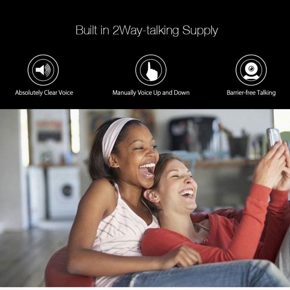 This image highlights the two-way audio communication feature of the camera, enabling users to interact remotely.