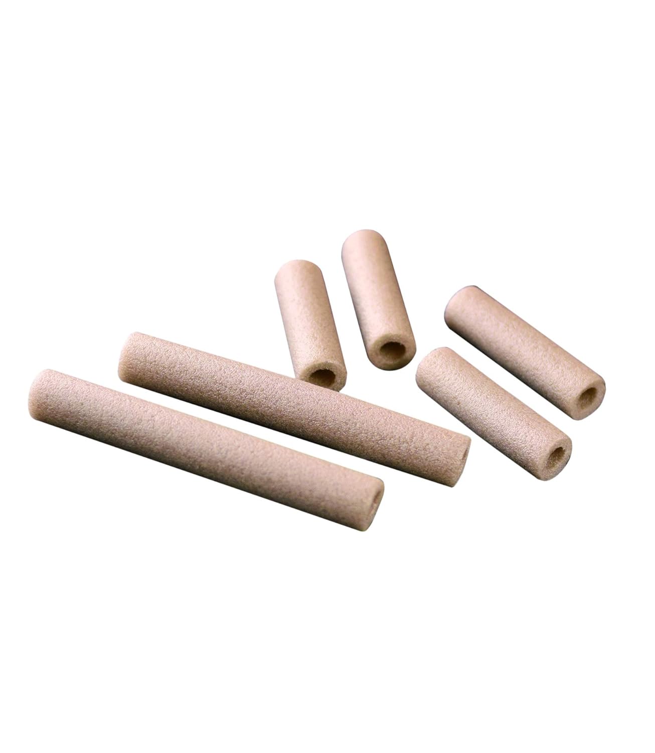 Слика 1: NSP NZ-NCLSP Air Conditioned Clothing Spacers. This image displays six individual spacers, which are beige, cylindrical, and have hollow centers, indicating their role in creating airflow channels within the clothing.