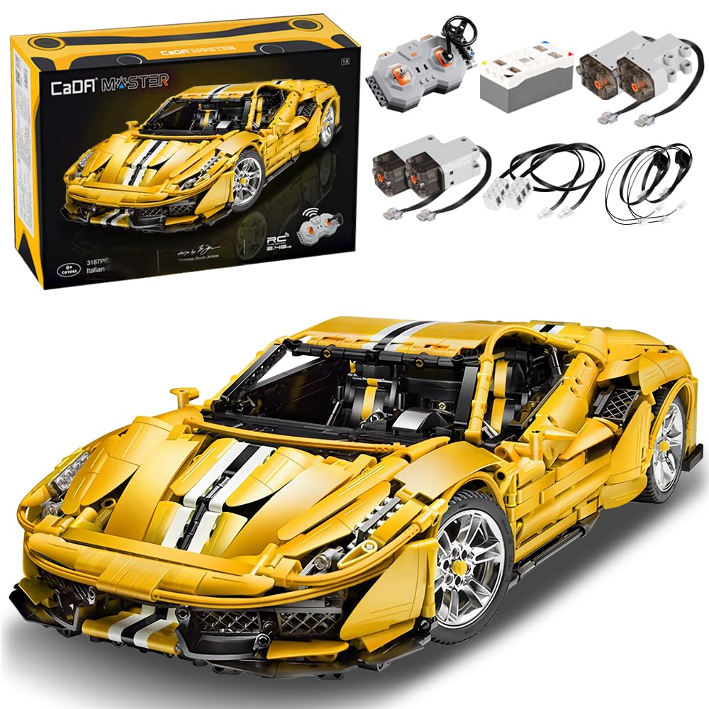 Image: The CaDA Master C61057W 488 Supercar model in yellow, showcasing its intricate design and the included remote control.